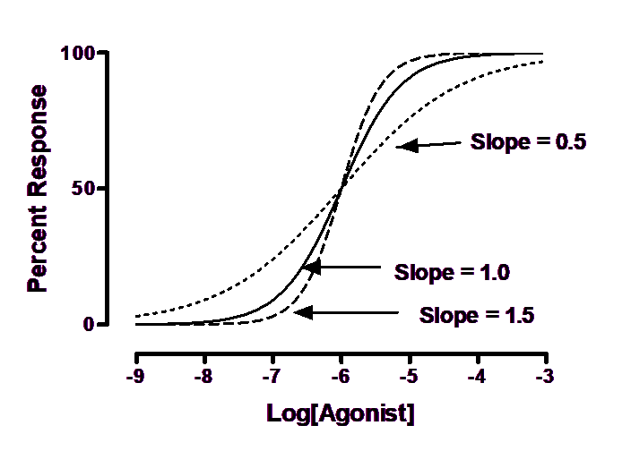 有些剂量反应曲线比标准曲线更陡或更浅。陡度用希尔斜率来量化,也称为斜率因子。一条具有标准斜率的剂量反应曲线的希尔斜率为 1.0。曲线越陡,斜率因子越高,曲线越浅,斜率因子越低。