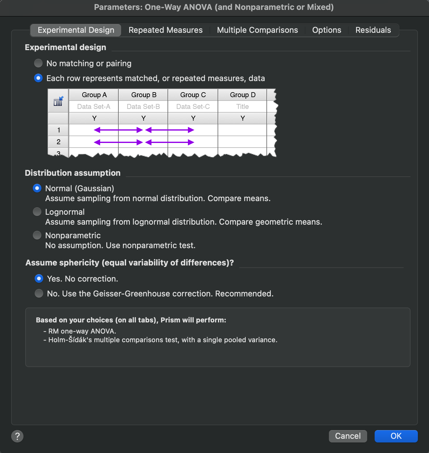 重复测量一词严格适用于对一个受试者反复进行治疗的情况(上述第一个示例)。另外两个本示例称为随机区组实验(每组受试者称为一个区组,在每个区组内随机分配治疗)。重复测量和随机区组实验的分析方法相同,Prism 总是使用重复测量一词。