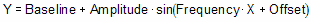 X 的单位是弧度。在大多数情况下,您需要将基准线固定值为零。加速度(AMPLITUDE)是曲线偏离基线的最大高度。频率(FREQUENCY)是每 1 X 单位的完整振荡次数。