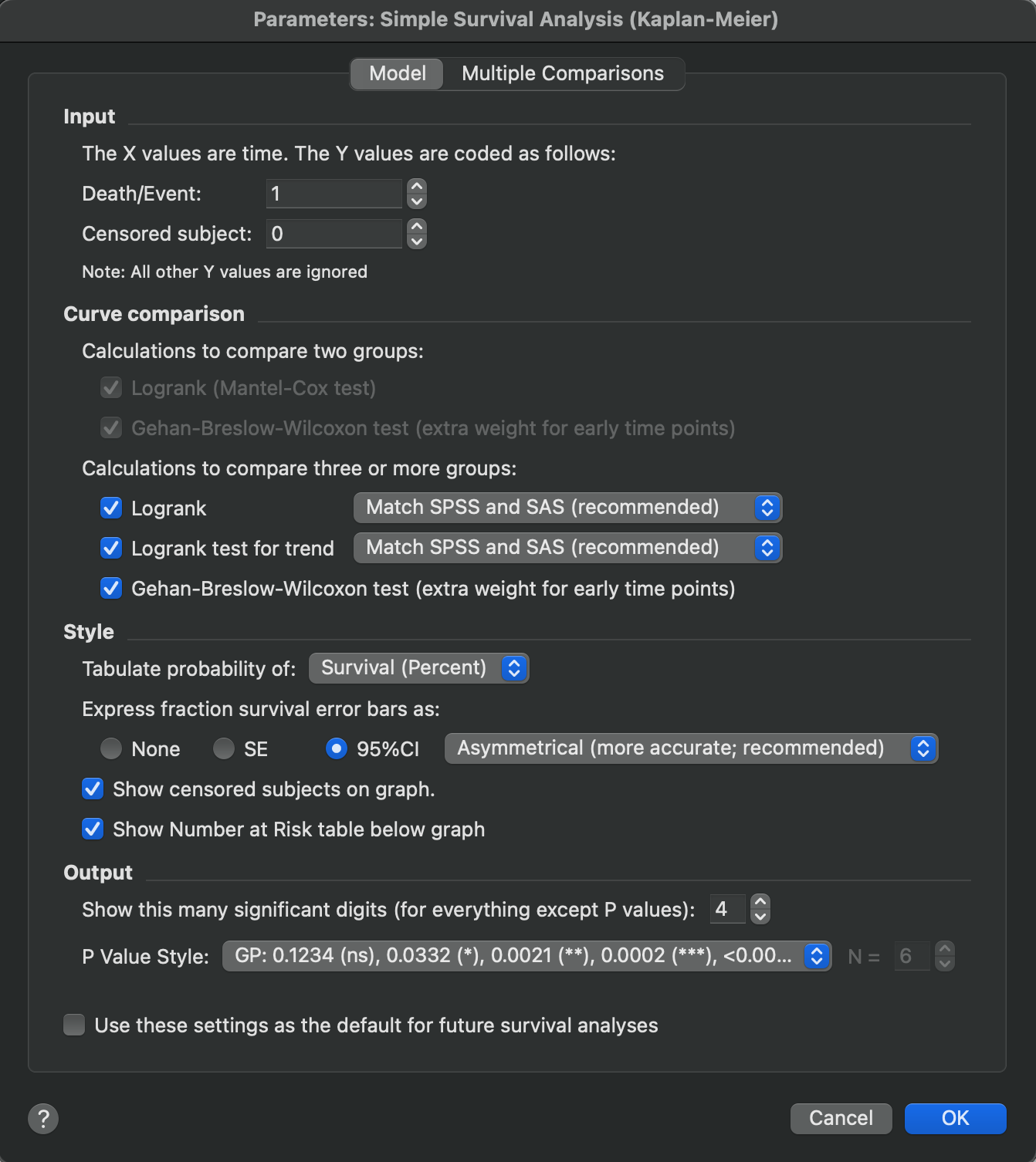 在 Prism 提供的分析中,生存分析是独一无二的。当数据输入生存数据表时,Prism 会自动执行数据分析并生成Kaplan-Meier 生存曲线。您无需使用 "分析"工具栏按钮或从 "分析 "菜单中选择分析,也无需在分析参数对话框中指定任何选项。Prism 将使用默认选项进行分析并为您生成结果。