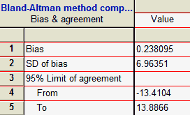 如果使用样本数据,两种方法的平均结果非常相似,偏差(均值之差)仅为 0.24。95% 的一致性界限在-13.4 到 13.9 之间。