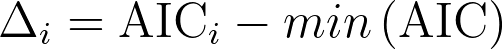 在比较模型时(例如,比较同一数据的两个竞争模型或比较指定模型与空模型),可以使用每个模型的相应 AIC 值来计算每个模型正确的"概率"(假设这些是唯一 可能的模型,因此其中一个模型一定是正确的)。为此,我们可以使用两个 AIC 值之间的差值。首先,我们为每个模型定义一个新值: