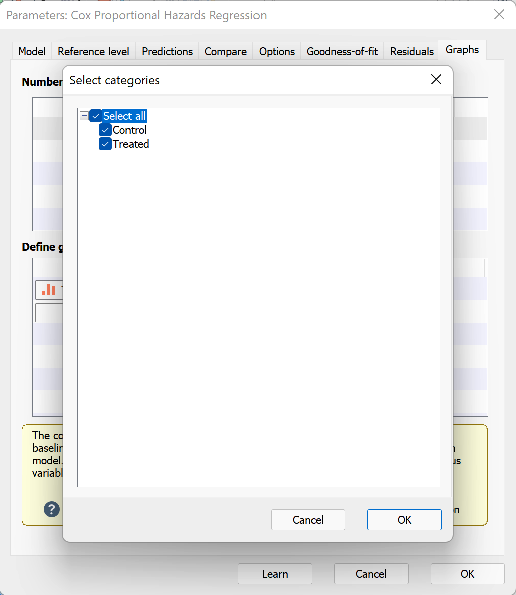 添加图形时,可以选择在每个图形上包含基线生存曲线。这与"基线函数"结果表中报告的曲线相同。本示例中我们不启用该选项。选择上方方框中的每张图表后,我们就可以在下面的"定义要生成曲线的组别"部分指定要包含在每张图表中的变异性变量。在对话框上部框中选择"估计存活率 #1"后,我们将使用对话框下部框中的下拉菜单选择"治疗_组"变量。默认情况下,选择变量时会包含分类变量的所有级别。要确认"对照组"和"治疗组"两个级别都选中了,我们可以点击"选择"按钮,查看指定变量的所有可用级别列表。