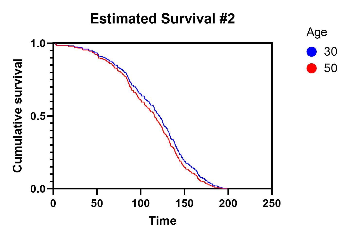 以图表形式直观显示分析结果是了解分析结果的最佳方法之一。对于 Cox 回归,研究不同组别个体随时间变化的估计存活概率通常很有意义。这些组别是根据回归模型中预测因子变量的值来定义的(例如,"女性"与"男性",或"吸烟者"与"非吸烟者")。更重要的是,这些组别不一定要由单一变量来定义(例如"45 岁男性"、"45 岁女性"、"50 岁男性"和"50 岁女性")。