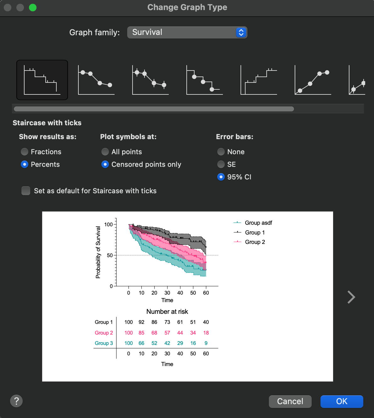 Prism 会自动分析输入生存数据表中的数据,并将生成的Kaplan-Meier 生存曲线绘制成图。首次导航到图形时,会出现一个对话框,其中提供了一些自定义图形的基本选项。这些选项大多不言自明。