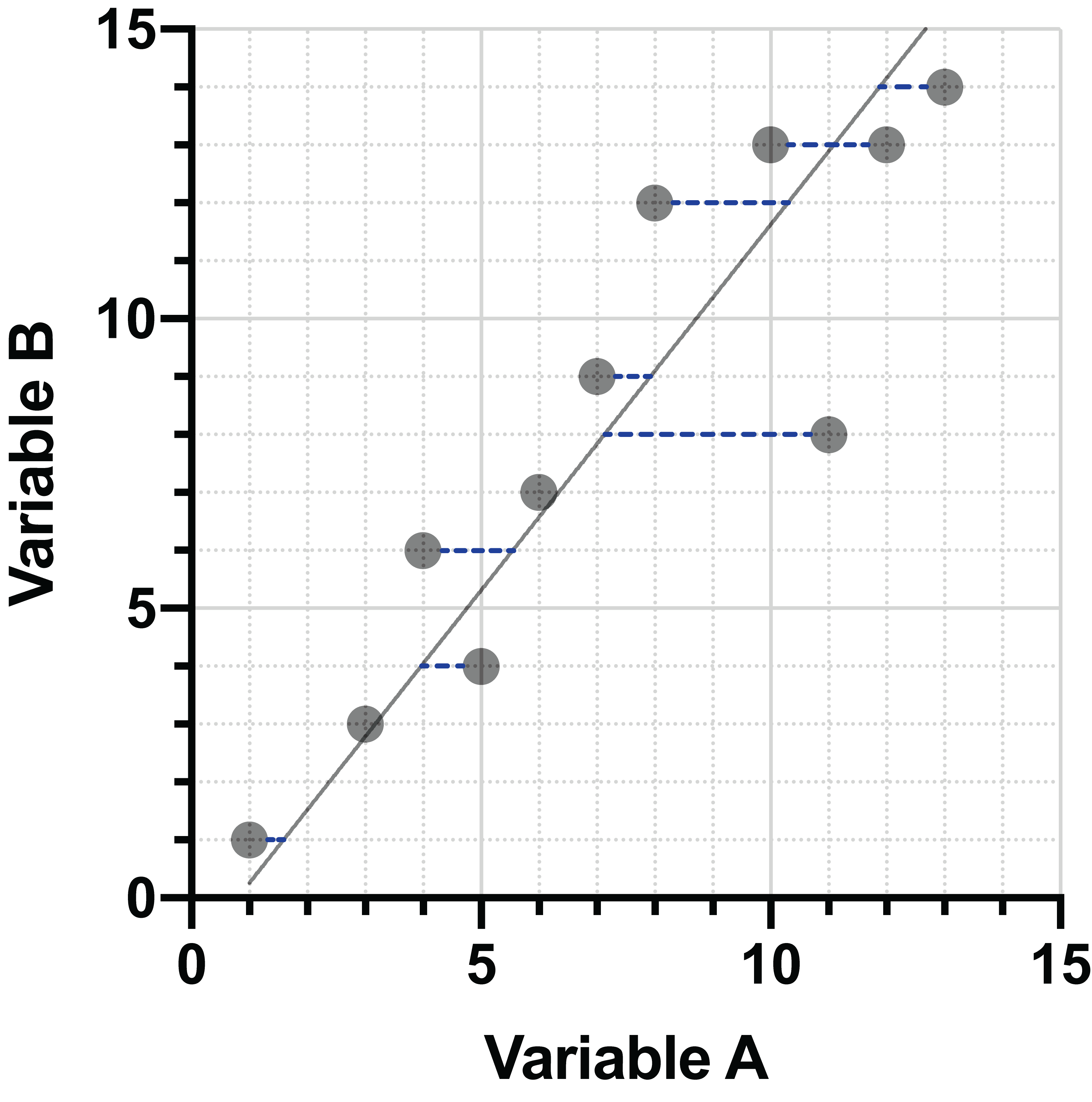 利用标准化数据,现在让我们看看如何将这些点投影到一条直线上,同时使点与直线之间的水平距离和垂直距离最小化。由于我们对数据进行了标准化处理(即 X 方向和 Y 方向的方差相同),这就等同于最小化点与直线之间的垂直距离: