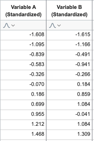 我们将对这些数据进行标准化处理。为此,我们首先要计算每个变量的平均值和标准偏差。然后,对于变量中的每个值,减去该变量的平均值,再除以其标准偏差(有时也称为值的 Z 分数)。对于这些数据,标准化后的数值如下(四舍五入):