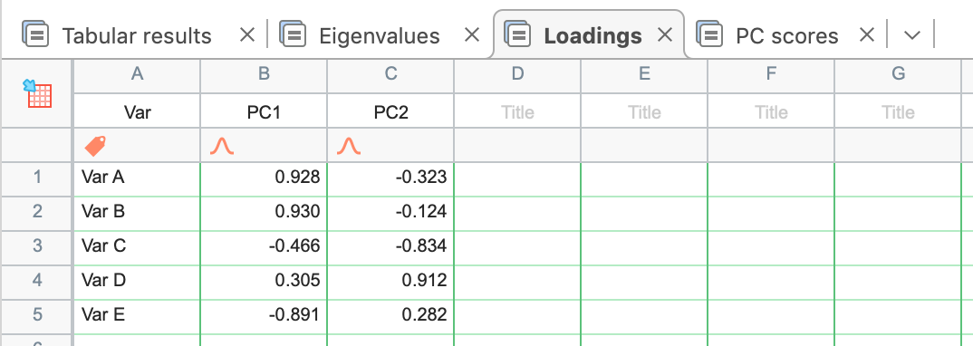 下一个选项卡名为 "载荷",它提供了与本指南之前讨论过但未明确提及的主题相关的信 息。该表以单独一列的形式列出了每个选定 PC 的载荷,并在单独一行中列出了每个原始变异性。虽然单个载荷由一组多个值(每个单独变量一个值)定义,但这些单独值是计算载荷的特异性变量与 PC 之间的相关性。