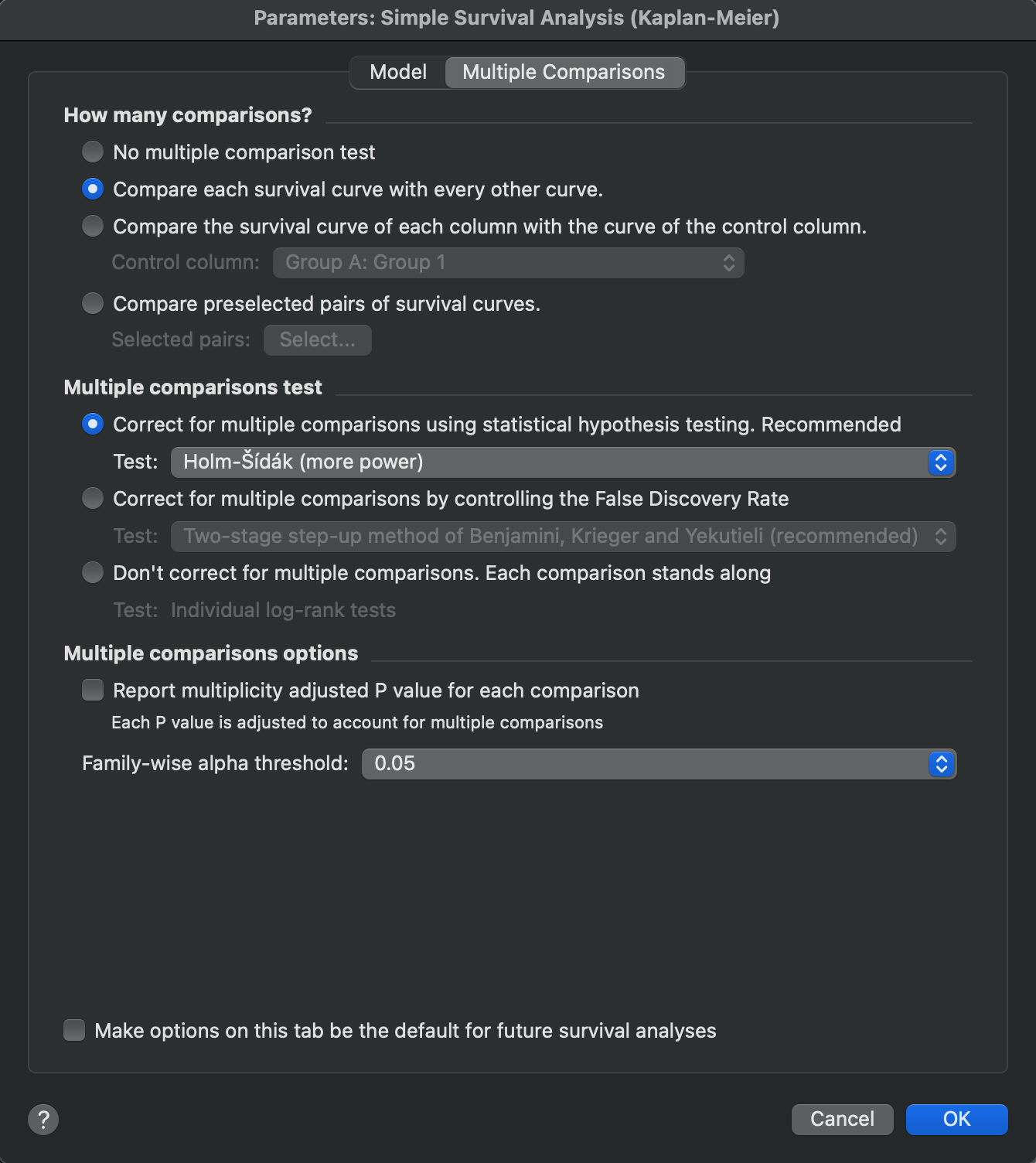 1.Holm-Šídák- 该检验是 Prism 在生存分析后校正多重比较的默认方法。它的检验力通常高于其他选项