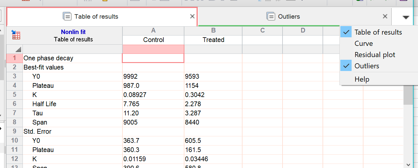 Prism 中的许多分析都在不止一个表格中显示结果。在Prism 8 之前,这些表格被称为结果的 "视图 "或 "子页面",显示在导航器的主结果条目下。从Prism 8 开始,这些表格显示为分析选项卡。下面是在第二个选项卡中显示的非线性回归结果(可选异常值检测)。
