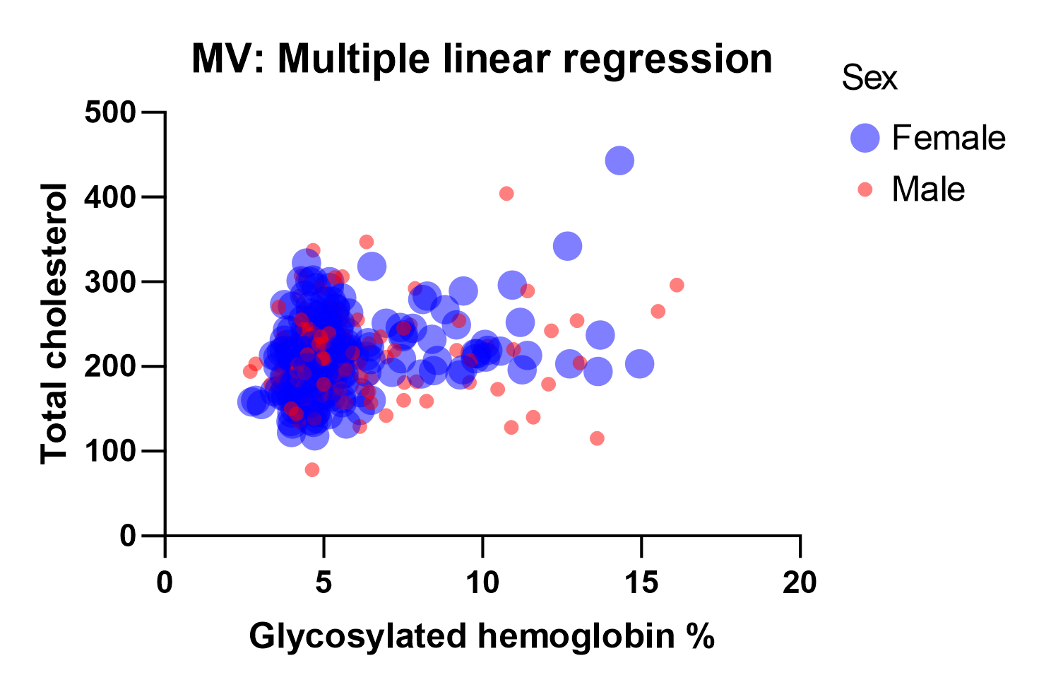 在这个图表中,符号的颜色和大小都是由同一个分类变量 "性别"定义的。对于该图表