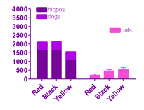 •有时,将堆叠条形图和交错条形图合并到同一图表中会很有帮助,如下图所示。具体做法是选中选项,将 "dogs"数据集堆叠在河马之上,并使 "cats"数据集分组。