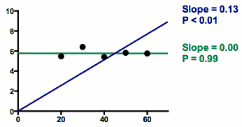 若在拟合线性回归时附加“直线必须经过原点”的约束条件(蓝色线),结果将大不相同。 为了使直线既通过原点又接近数据点,最佳拟合直线的斜率必然远离零。由于该直线远离水平线,因此 P 值极小。在直线必须通过原点(X=0, Y=0;图表左下角)的约束条件下,数据充分表明最佳拟合直线远离水平线,因此 P 值极小是合乎逻辑的。