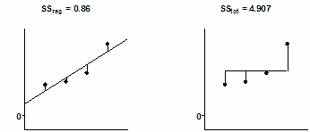 左侧面板显示了最佳拟合线性回归直线。该直线使各数据点与直线的垂直距离平方和最小。 这些垂直距离也显示在图的左侧面板中。在本示例中,这些距离的平方和(SSreg)等于 0.86。其单位是 Y 轴单位的平方。要将此值用作拟合优度的衡量标准,必须将其与某项进行比较。