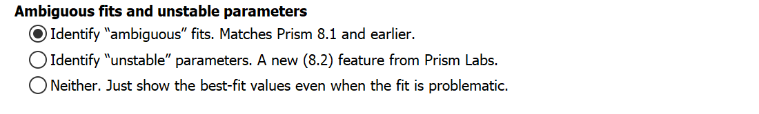 从 Prism 8.2 开始,针对所选模型无法完全由现有数据定义的情况,我们提供了多种处理方式供您选择。这些选项包括识别“模糊拟合”的结果、识别“不稳定参数”,或者不进行任何识别。在 Prism 8.2 之前,Prism 始终会识别“模糊拟合”的结果。 我们发现,识别“不稳定参数”的选项似乎效果更好,但我们仍提供所有这些选项供您选择,以便您获得与先前版本一致的结果。该选项位于非线性回归对话框的“置信区间”选项卡中。