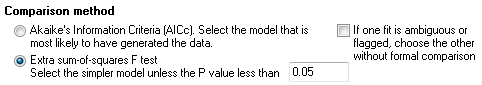 •如果模型不具有嵌套关系,则 F 检验不成立,因此应选择 AICc。请注意,Prism 不会强制执行这一限制。即使模型不具有嵌套关系,它仍会计算 F 检验,但结果将没有实际意义。