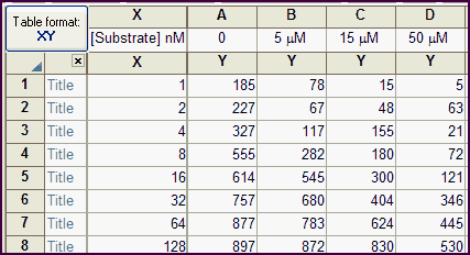 该数据表包含一个 X列和四个 Y 列,每列代表不同浓度的抑制剂。抑制剂浓度以列标题形式输入。