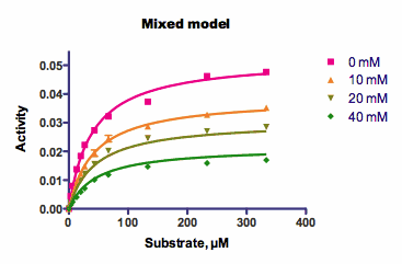 上图展示了竞争性酶动力学的样本数据,并演示了如何拟合曲线族。在此,每条曲线都表示酶活性与底物浓度的函数关系。这些曲线之间的差异源于不同浓度的抑制剂存在。本质上,这里有两个独立变量:底物浓度和抑制剂浓度。