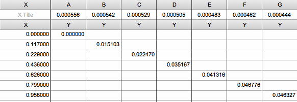 8.继续处理剩余数据。您将沿表格对角线向下输入数据。由于 Prism 最多只能包含 104 列,因此您将受到 104 个数据点的限制,每个数据点包含一个 Y 值和两个 X 值。