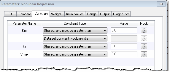 •对于模型中的所有其他参数,请使用“约束”选项卡在数据集之间共享其值。Prism 将每列视为一个数据集。在此数据表中,每个数据集仅有一个值,因此除非所有参数均被共享,否则 Prism 无法进行任何拟合。