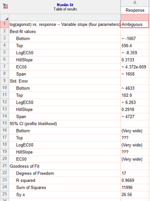 请注意结果顶部的“模糊拟合”一词。这意味着 Prism 无法为这些数据找到唯一的拟合结果。许多参数值组合都能得到同样贴合的曲线。了解更多关于模糊拟合的信息。