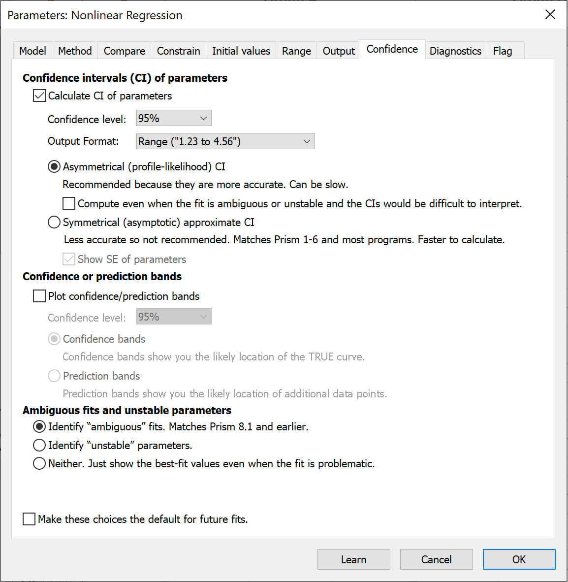 在非线性回归对话框的“置信度”选项卡中,请确保已选中“识别‘模糊拟合’”选项(此选项已不再是默认选项,我们现在建议您改用“识别‘不稳定’参数”选项)。