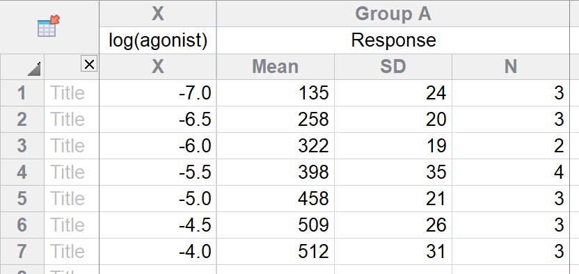 X 值为摩尔浓度的对数。Y 值为响应值,以均值和标准差(SD)的形式输入。在 Prism 中,您可以输入重复测量值,也可以输入在其他地方计算出的误差值(此处为 SD)。