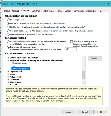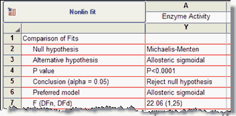 结果的顶部部分总结了比较情况。P 值较低,表明简单模型(米氏-门登)过于简单,应予以拒绝。别构模型的拟合效果明显更好。