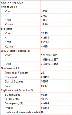 参数 H 等于 2.0,其 95% 置信区间为 1.5 至 2.5。数值 2.0 表明该酶可能是二聚体。当 H 等于 1.0 时,别构模型与米氏-门捷列夫模型完全一致。