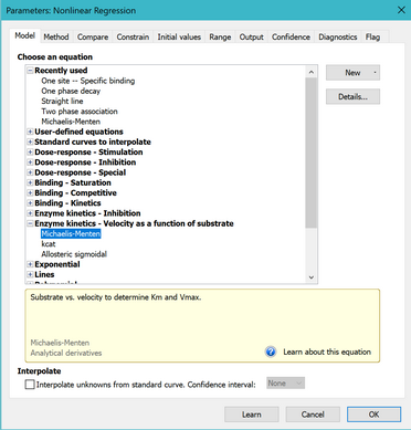 在“拟合”选项卡中,选择(或确保仍已选择)米哈利斯-门登方程。