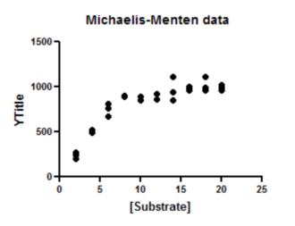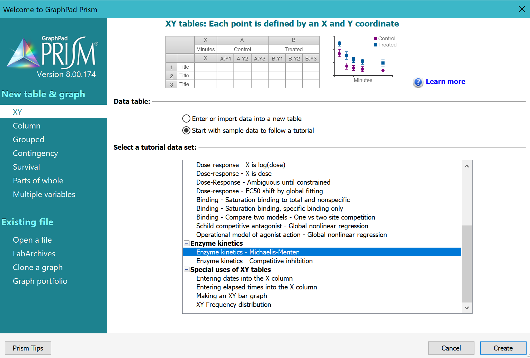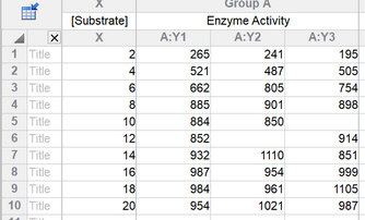 在“欢迎”或“新建表格”对话框中,选择创建 XY 数据表,选择教程数据集,并从酶动力学部分中选择示例数据“酶动力学 - 米氏-门捷列夫”。