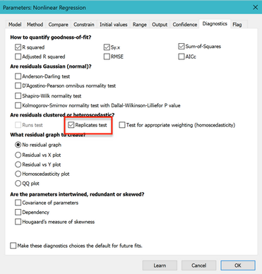转到“诊断”选项卡,勾选执行重复样本检验的选项。请注意,您还可以勾选一个选项,使此处的设置成为未来拟合的默认设置。