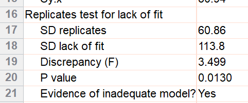 P 值较小(0.013)。这意味着数据与曲线的偏差程度大于根据三组重复实验的变异性所预期的范围。这表明您可能需要考虑拟合另一种模型,我们在本示例中将进行此操作。