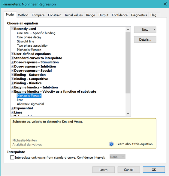 在非线性回归对话框的“拟合”选项卡中,打开方程文件夹“酶动力学 - 底物与反应速率”。然后选择米氏-门登方程。