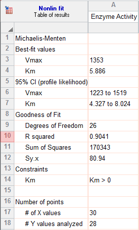 非线性回归的目标是找到参数的控制数据。这些数据显示在表格顶部。如果不了解这些控制数据的精确程度,就无法对其进行准确解读,而其精确程度通过标准误差和置信区间来表示。