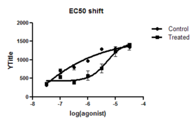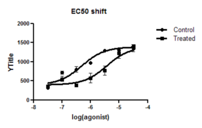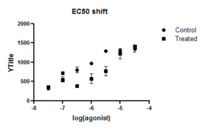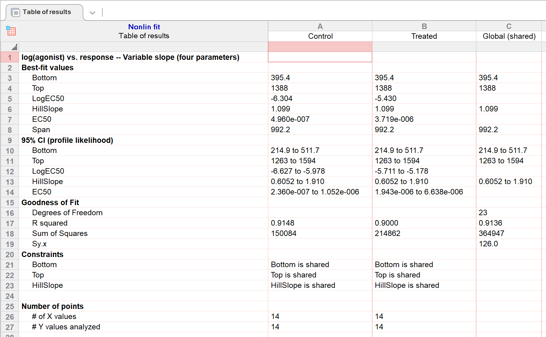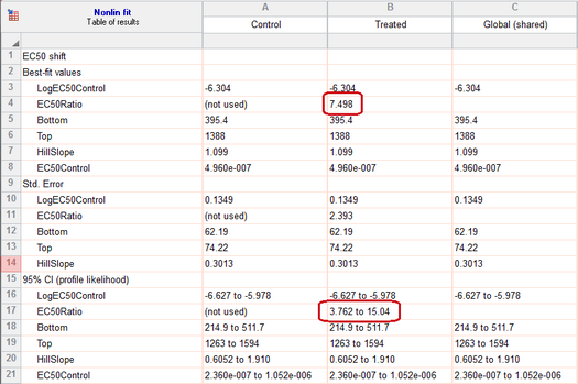 如果您愿意假设在对照组和处理组条件下,顶部和底部的平台期以及斜率是相同的,那么您可以从这组数据集中获得更好的结果。换句话说,您假设处理会改变 EC50,但不会改变基础反应、最大反应或Hill斜率。