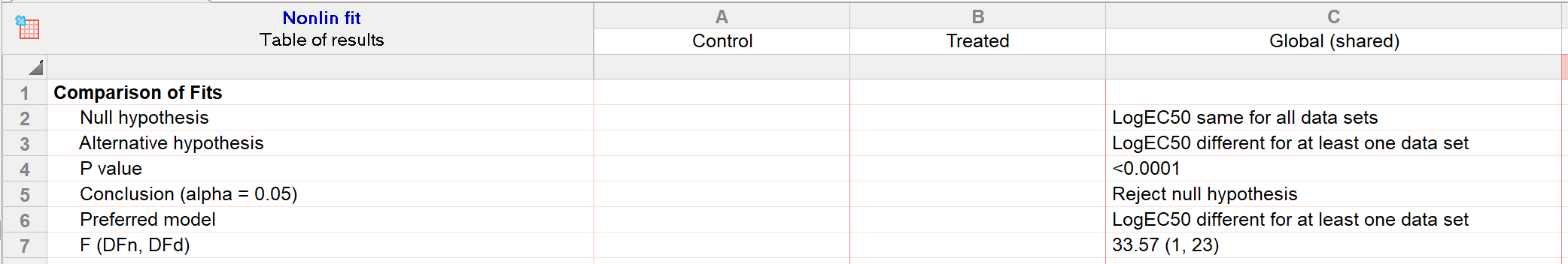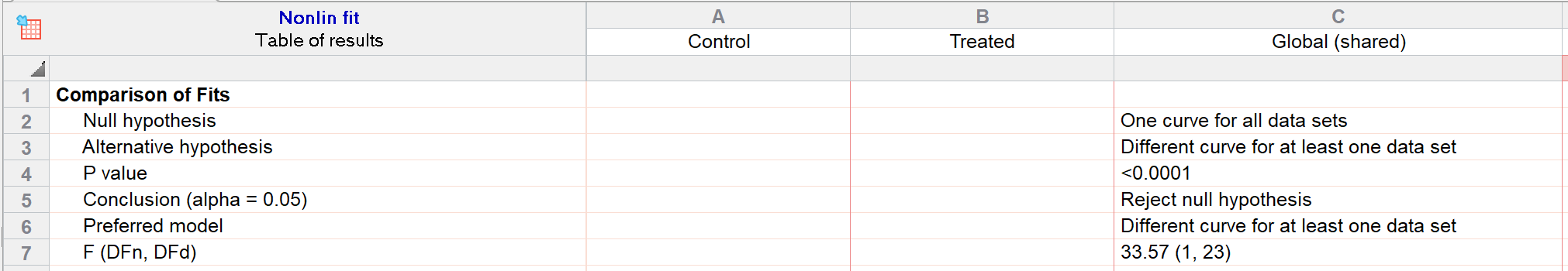 请注意,由于所有参数均被共享,您本可在分析参数对话框的“比较”选项卡中选择“一条曲线能否充分拟合所有数据集?”这一选项。在这种情况下,这两种比较方法将具有等效性(同样是因为所有参数均被共享),且比较结果将相同(尽管结果表中的表述会略有不同):