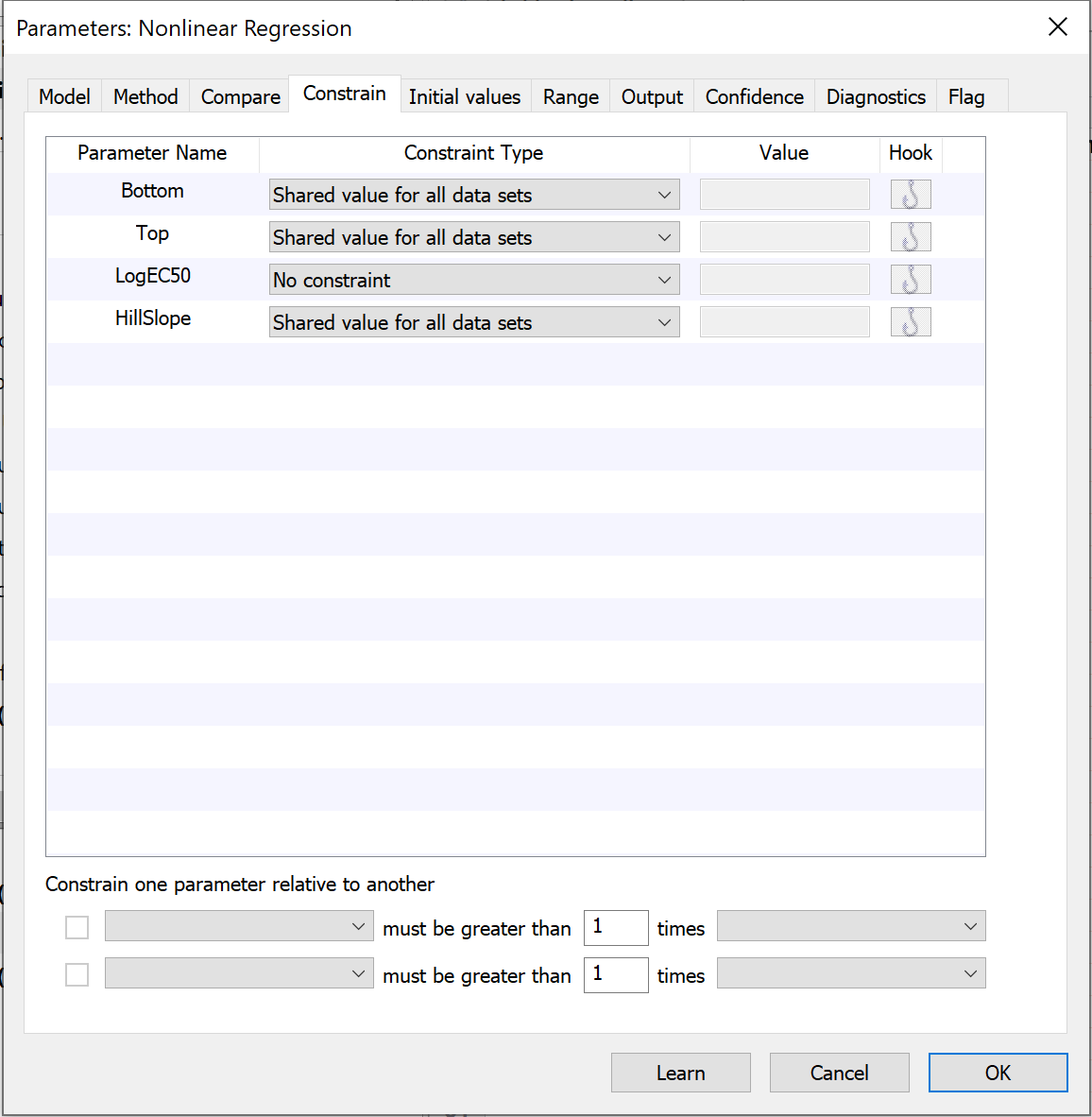 转到“约束”选项卡,选择共享“底部”、“顶部”和“坡度”的值。当您共享这些参数时,Prism 会对数据集进行全局拟合,以求得“底部”、“顶部”和“坡度”的单一最佳拟合值(适用于两个数据集),并分别求得 logEC50 的最佳拟合值。