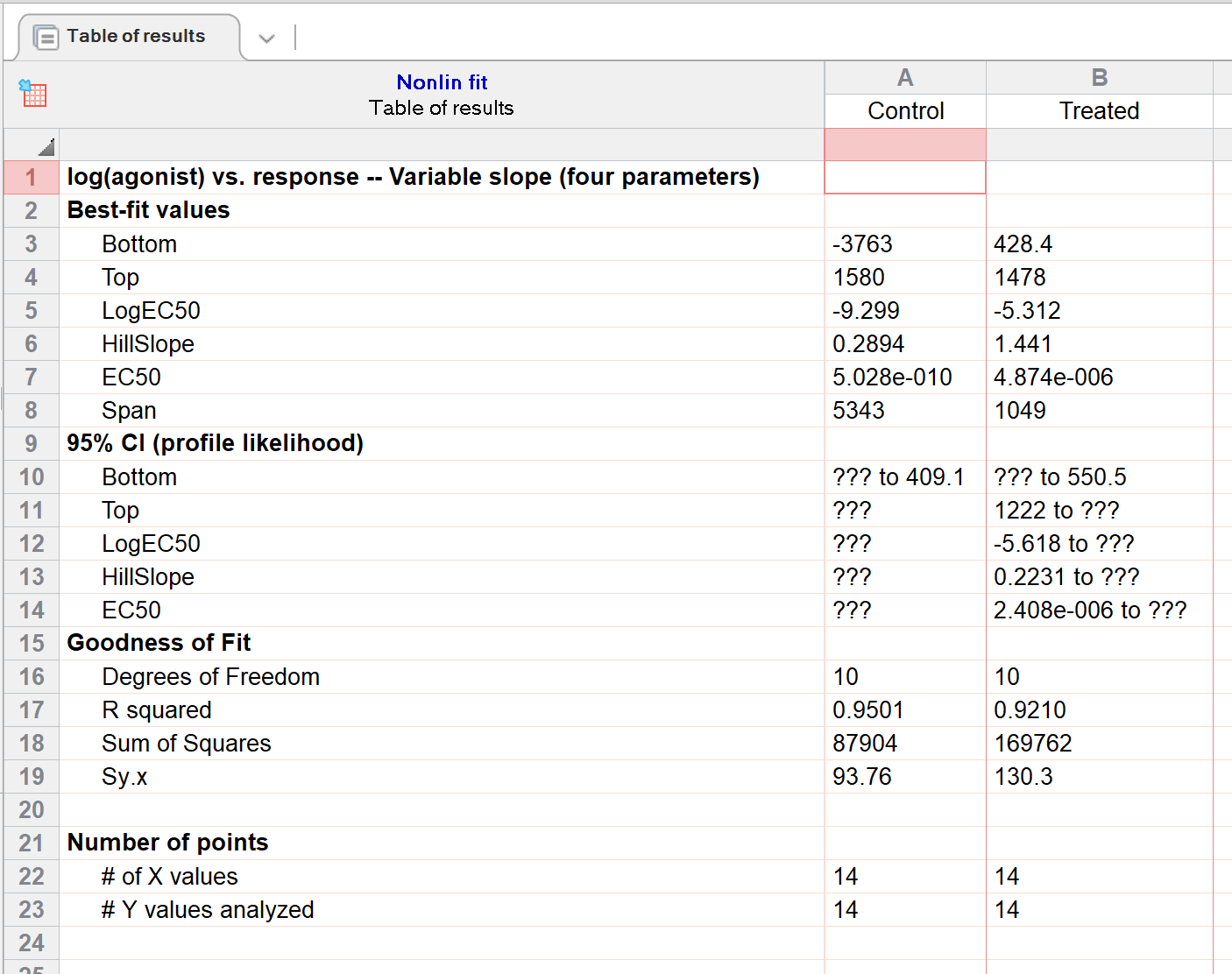 Prism无法为这些最佳拟合参数计算完整的95%置信区间,原因是数据未能充分定义曲线(例如,控制数据未能定义曲线的底部平台)。EC50是指在曲线底部平台与顶部平台之间产生中等反应浓度的浓度。如果无法准确定义底部平台,则也无法确定EC50。