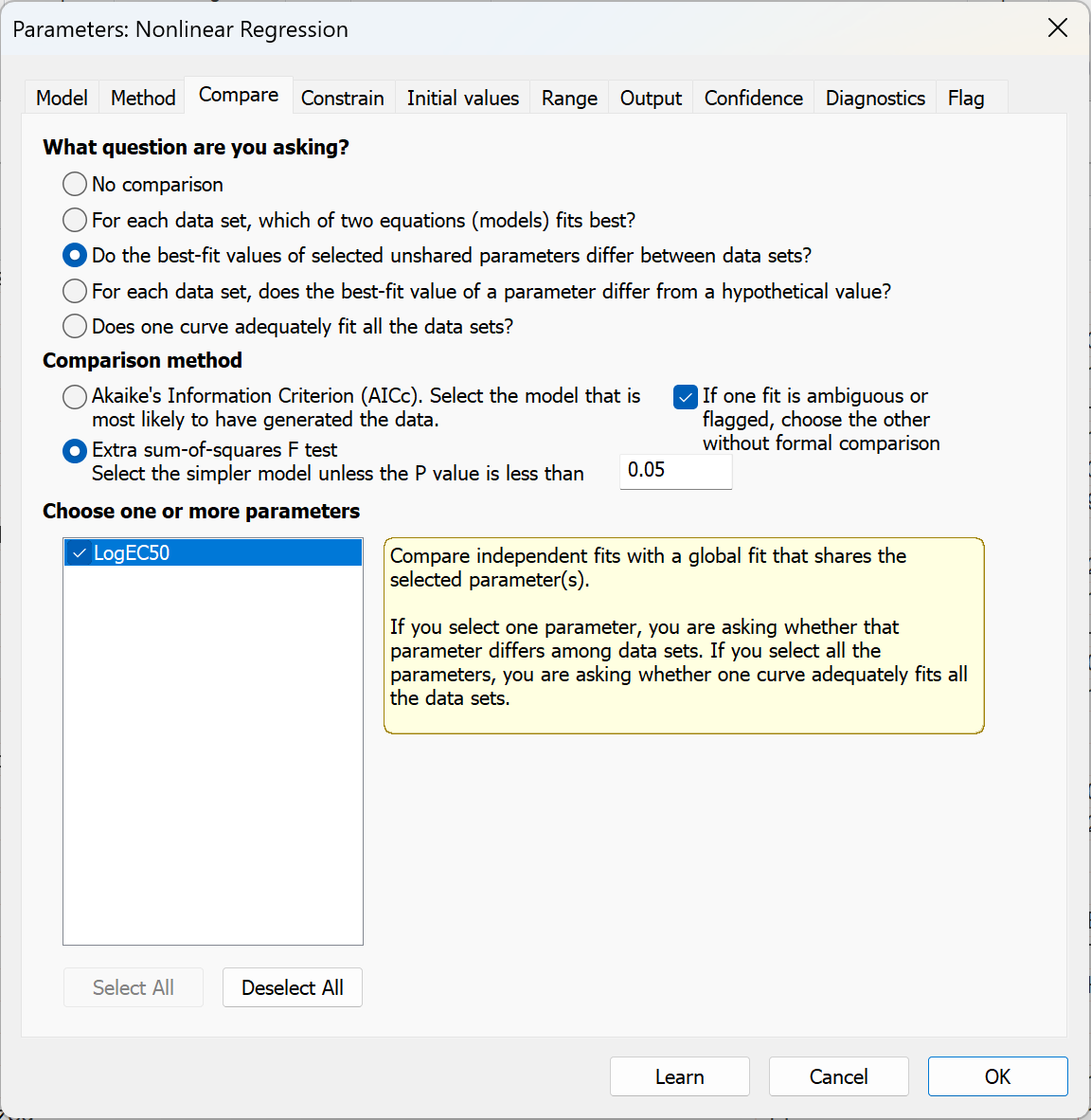 返回非线性回归的参数对话框,转到“比较”选项卡。选择该选项以检验所选的非共享参数在数据集之间是否存在差异。确保已选中“额外平方和F检验”,然后勾选“LogEC50”旁边的复选框。