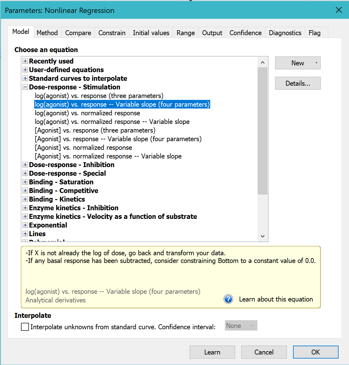 在非线性回归对话框的“拟合”选项卡中,转到“剂量-反应-刺激”模型,然后选择:log(激动剂) 与反应值 - 变量斜率。