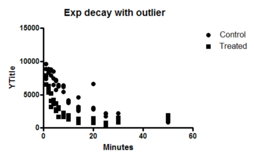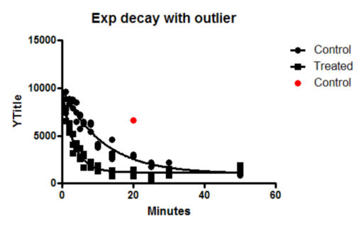 Prism 识别出了该异常值,并将其以红色标注,叠加在数据图上。识别出异常值后,Prism 会将剩余的数据点进行拟合,仿佛该异常值不存在一般。在接受结果之前,请思考该点为何会被视为异常值。请记住,并非所有异常值都是“错误”的数据点。