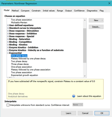 在非线性回归对话框的“拟合”选项卡中,打开指数方程面板,并选择:“单相衰减”。