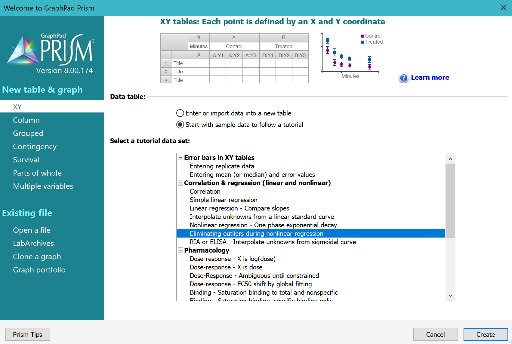 在“欢迎”或“新建数据表”对话框中,选择创建 XY 数据表,选择使用教程数据,并选中示例数据“非线性回归中的异常值剔除”。