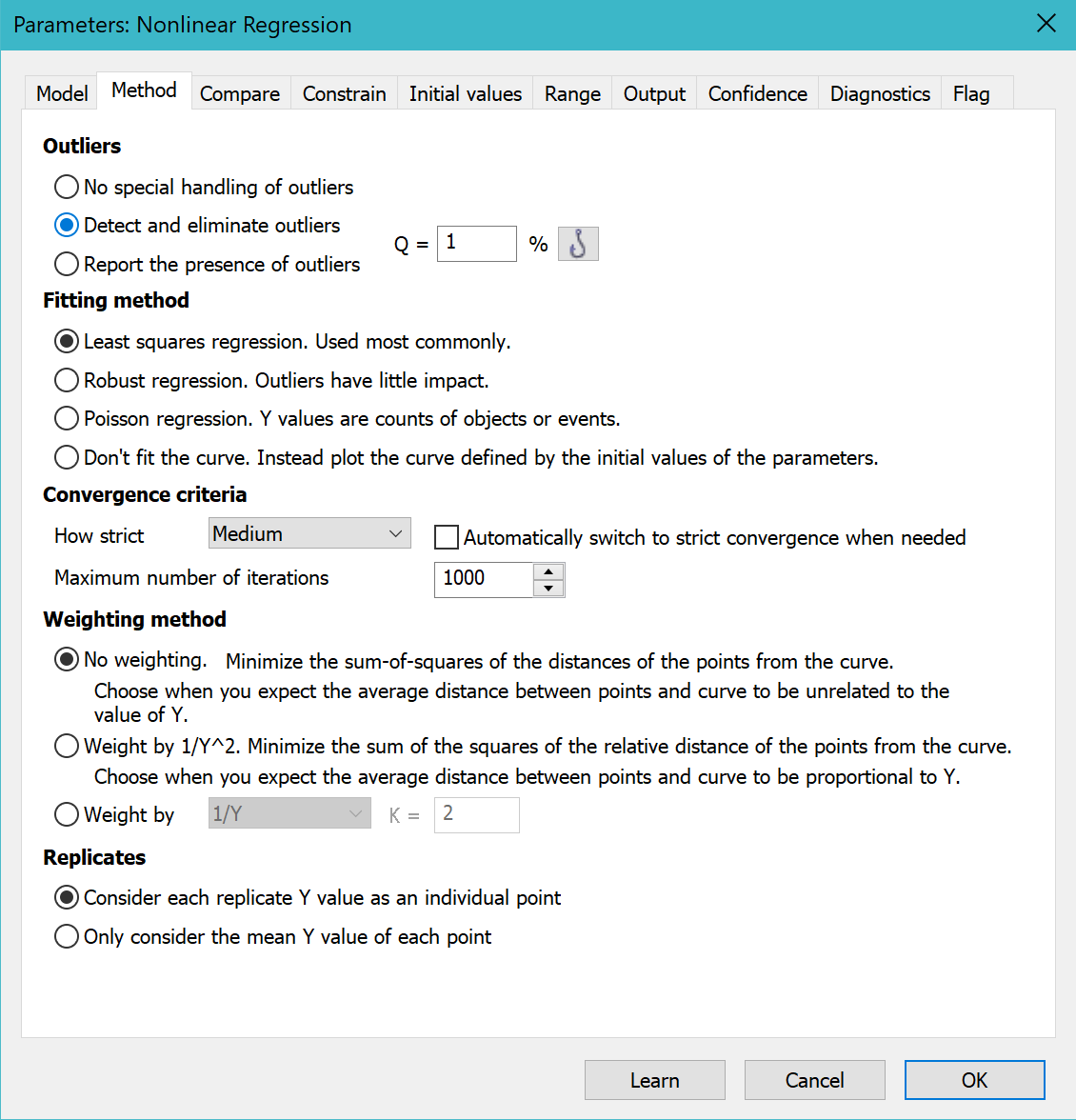Prism 在使用非线性回归拟合曲线时,采用了一种独特的方法来识别异常值。本示例将向您展示使用 Prism 识别异常值是多么简单。了解更多关于该方法的工作原理、适用场景以及何时应避免使用它。