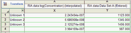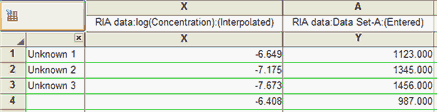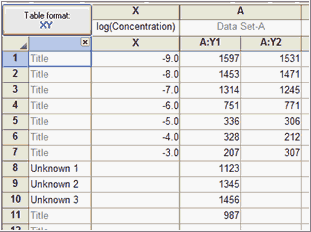 前七行包含两份标准曲线。其下方是三个未知值。这些未知值有您测得的 Y 值,但没有 X 值。本次分析的目标是插值求出这些未知量的对应 X 值(浓度)。请注意,四个未知量中有三个标有标签,以便您稍后将结果与标签进行匹配。
