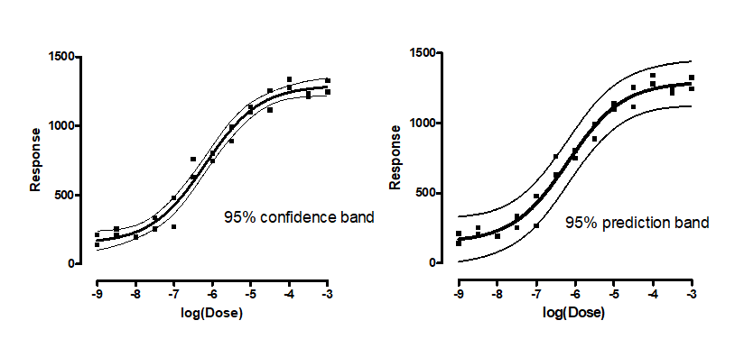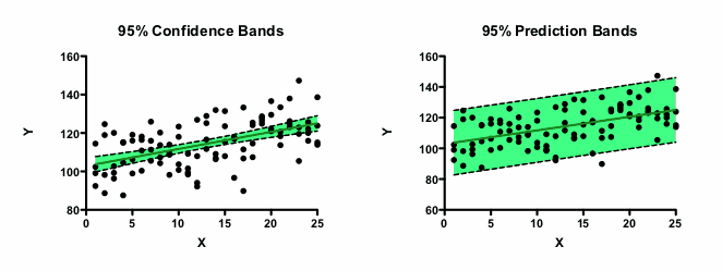 置信带显示了您对最佳拟合直线或曲线的定位有多准确。在分析的所有假设条件下,您可以有 95% 的把握认为真实曲线(非线性回归)或直线(线性回归)位于该区间内。