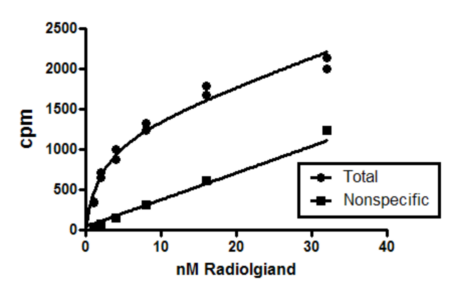本实验通过测量不同浓度放射性配体在受体上的平衡结合情况,以确定该放射性配体的Bmax和Kd值。由于配体既会结合目标受体,也会结合非特异性位点,因此实验同时测定了总结合量和非特异性结合量(即在过量未标记受体拮抗剂存在下放射性配体的结合量)。