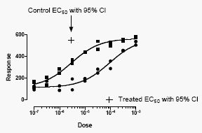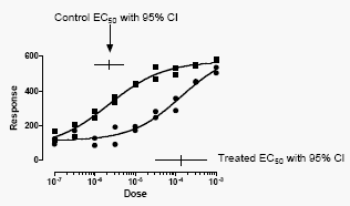 虽然曲线很好地拟合了数据点,但置信区间却相当宽。我们实际上并未以足够精确的程度确定 EC50,因此无法得出有用的结论。问题在于,控制数据(方块)并未真正界定曲线的底部平台,而处理组数据(圆圈)也未能真正界定曲线的顶部平台。 由于数据未能很好地界定最小和最大响应值,因此也无法清晰界定最小与最大响应值之间的中点。相应地,每个EC50的置信区间跨度超过了一个数量级。该实验的全部目的本在于确定这两个EC50值,但控制数据的不确定性已超出可接受范围。