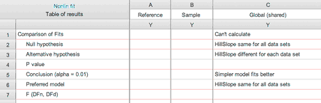 Prism 会标注零假设和备择假设,并报告 P 值。您可在非线性回归对话框的“比较”选项卡中设置阈值 P 值。若 P 值小于该阈值,Prism 将选择(并绘制)备择(复杂)模型。它还会报告 F 值和自由度,但这些信息仅在您需要将 Prism 的结果与其他程序或手动计算结果进行比较时才有用。